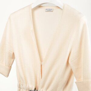 Brunello Cucinelli Cream Cashmere Drawstring-Waist Elbow-Sleeve Cardigan