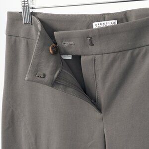 Made in Italy, these pants from Brunello Cucinelli are crafted in a grey stretch cotton twill, and feature a front hook and zip fly closure, belt loops, back buttoned welt pockets, a panelled design, and skinny-cut legs.