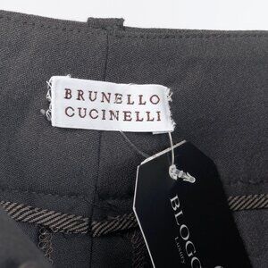 Made in Italy, these trousers from Brunello Cucinelli are crafted in a grey virgin wool suiting, and feature a front double-button and zip fly closure, belt loops, a right slanted pocket, a left buttoned welt change pocket, a back buttoned welt pocket, and straight-cut legs.