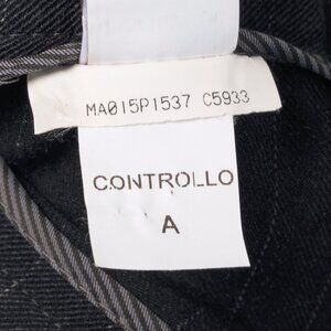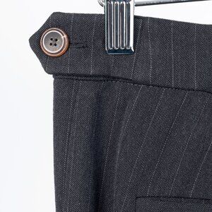 Made in Italy, these trousers from Brunello Cucinelli are crafted with a grey pinstripe wool-blend suiting, and feature a partly elasticized waistband with buttoned straps on the sides, a front hook and zip fly closure, front slanted pockets, back buttoned welt pockets, patchwork detailing on the knees, tapered-cut legs, and ankle-length hems.