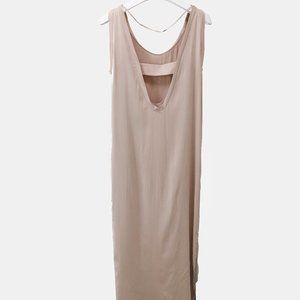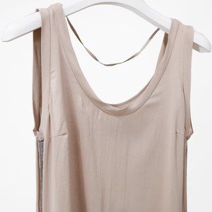A silk sleeveless maxi dress in nude by Brunello Cucinelli featuring a low back with a removable strap, a thin strap across the back shoulders, an asymmetrical hem, and minimalist silver beads running down the dress’ sides. The dress is lined with a matching silk slip-dress.