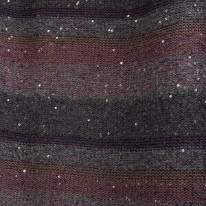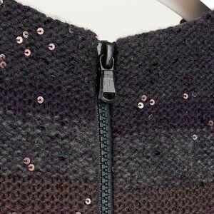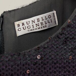This sweater from Brunello Cucinelli is crafted in a cashmere-blend knit with purple and grey stripes throughout, and is embellished with sequins all over. It features short sleeves, a round neck, a straight fit throughout the bodice, an exposed back zipper closure, and is lined in a grey silk-blend crepe.