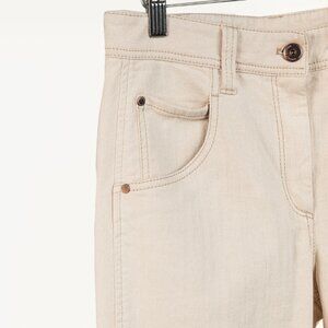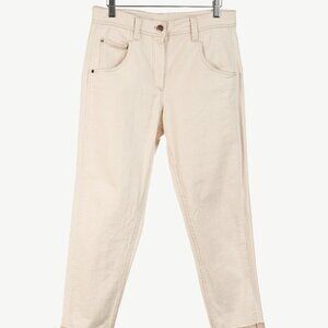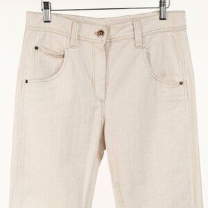 Made in Italy, these 5-pocket jeans from Brunello Cucinelli's 2020 Spring and Summer collection are crafted in a cream cotton-blend stretch denim, and feature a high rise, a front button and zip fly closure, belt loops, front curved pockets with a right change pocket, back patch pockets, a brown logo patch at the back, tapered-cut legs, and ankle-length cuff hems with distressing and Monili bead embellishments.