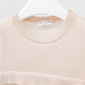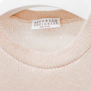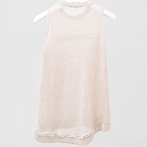 A slinky lightweight tank top knit from in a rosy peach yarn with small transparent tonal sequins that add a subtle shimmer, featuring a crew neckline, a sporty vent panel detail across the chest, and a long, loose hem that is longer at the back.