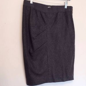 Classic skirt with architectural details that make it interesting. One panel is cut on the bias and accented with three draped pleats. It has a side zip, bound hem and is fully lined. Made in Italy. In very good used condition. No damage, no marks.