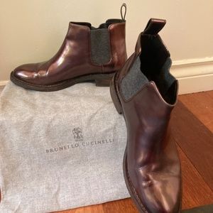 Patent leather copper ankle boots with dust bag. Some scuffing on inner ankles.