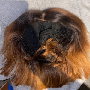 ⭐️Pre bleached knots/ sewn coloured wig cap /pre plucked hairline/ natural hair line deep part glue less Peruvian FYI this unit definitely needs some love and care ⭐️straight 10/12 inches free part ombre human hair wig. Elastic band for a more secured fit♠️Cap size is approx 21.5- 22” . 130 density in volume. Very beautiful/ bouncy on head / worn once with wig cap .No dandruff/ head lice. Can be straightened/ curled. Can be worn as side part/ centre part. Pls review listing details / condition carefully. No returns on wigs