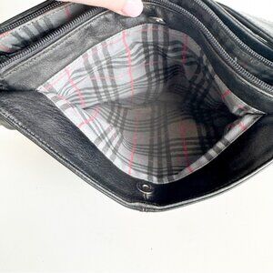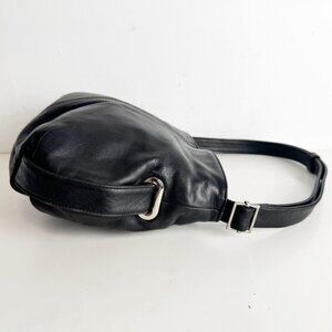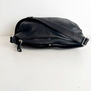 Elegant black leather shoulder bag, perfect for any occasion. Features a sleek design with a comfortable strap. Lined in plaid and has three compartments with multiple pockets