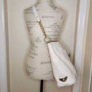 Gold studded White Pebbled Leather large hobo style satchel crossbody purse with removable gold chain sliding shoulder strap, by BRUNO MAGLI.