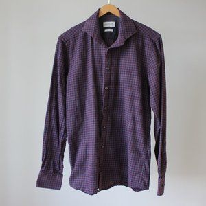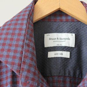 Bruun & Stengade button up shirt. Slim fit. Burgundy and blue plaid pattern. 100% cotton. Brand from Copenhagen. Size 15 3/4, 40