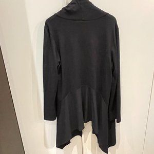 Selling a Bryn Walker Black Kai Jacket. Has no size on it but I would say it's a Large/Extra Large. It's a unique, asymmetrical jacket with a gathered, collarless neckline extending its entire length. It has an overall 'ruched' effect due to the drawstring. Meaning, the edge of the collar has ties that can be pulled to create ruching. 68% Modal, 24% Nylon, 8% Spandex. Gently used. I show one picture of the jacket in purple linen as it's a clearer picture to see how the jacket falls. Super soft and comfy and versatile.