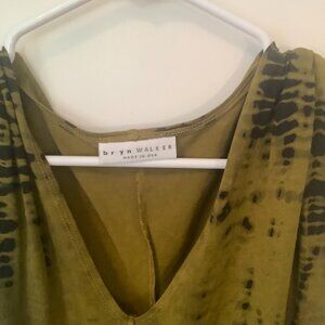 Olive green with black abstract print Bryn Walker tunic. V-neck, sleeveless, shorter front (31"/69 cm), longer back (35"/89 cm), altered because it was too long. 92% viscose 8% spandex jersey. Made in U.S.A. Perfect to wear with black leggings or pants. Bryn Walker fits large, so this top has oodles of room. Great casual wear.