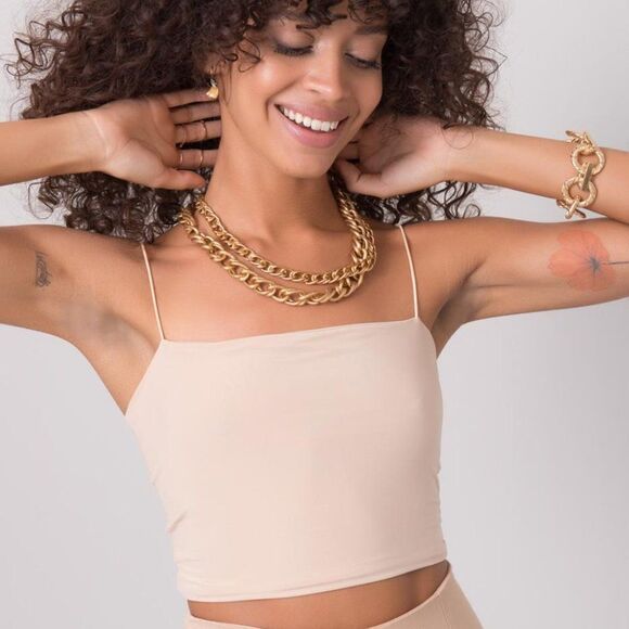 Bustier with rope straps. Slinky, soft and fitted. Colour is light beige.
