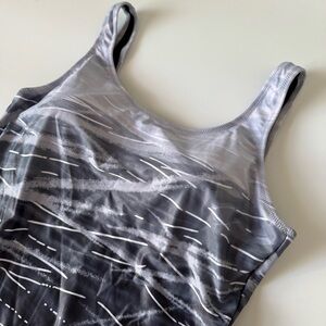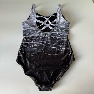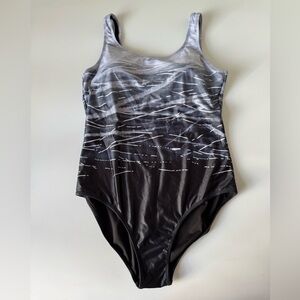 Dive into style with this elegant black and gray one-piece swimsuit. Perfect for a day at the beach or lounging by the pool.