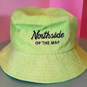 Fun, neon green, corduroy bucket hat made by local Toronto aritst, "Northside on the Map."
