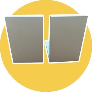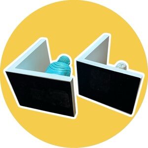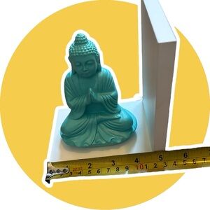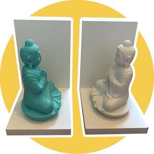 Decorative Buddha bookends in teal and white. Perfect for adding a serene touch to your space.