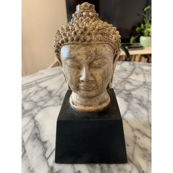 Buddha head fabricated from cement on a wood pedestal 9.5" in height.