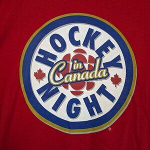 This t-shirt by Budweiser doesn't have a tag listing material content, but my best guess is cotton or a cotton/poly blend. The shirt is red with short sleeves and a round crew neck. The front of the shirt has a round logo in blue, white, and red that says, "HOCKEY NIGHT IN CANADA" and has the CBC logo behind it. The back of the shirt has a small white Budweiser lettering logo at the top. There is normal wear and I think the front graphic is slightly off-center, but there are no issues affecting wearability.