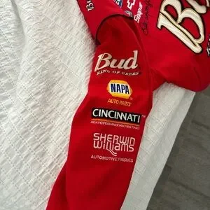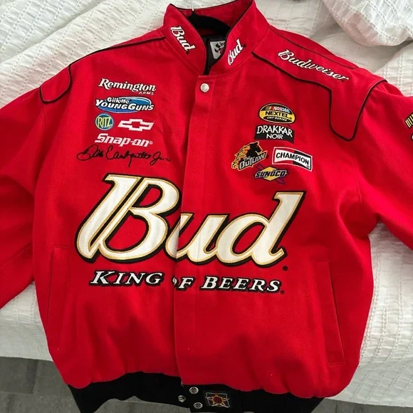 Bold Budweiser racing jacket. Features embroidered logos. Perfect for fans and collectors.