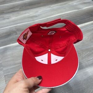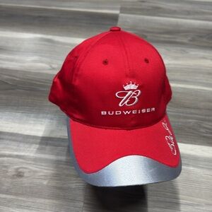 This vibrant red and white Budweiser hat features a classic 6-panel design with a curved brim and white piping accents. The front showcases an embroidered Budweiser logo, making it a stylish accessory for any casual outing. Crafted from durable cotton material, this cap is perfect for sunny days and outdoor adventures.