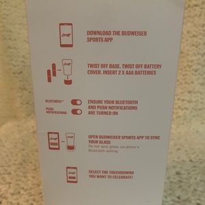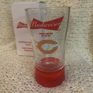 Budweiser touchdown glass. Synced with your phone it will flash red whenever your team scores a touchdown. 2 AAA batteries go into the removable red bottom of the glass. Remove bottom before washing the glass. Chicago bears logo on glass but you can sync glass to any team. New in box. Syncing instructions on box.