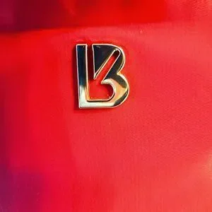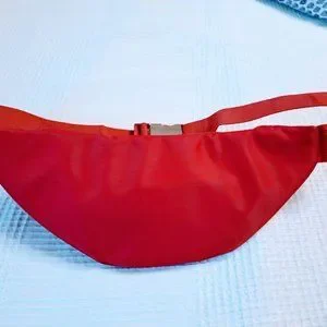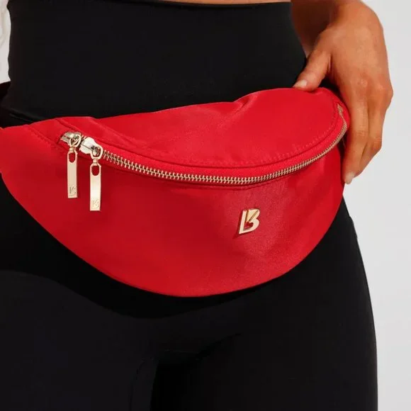 Stylish red fanny pack. Features gold zipper and logo. Perfect for on-the-go.