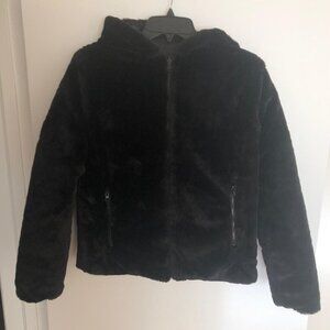 Jacket is lined throughout in tonal faux fur and has a removable woven label on the furry side.