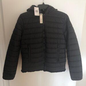 A nylon quilt reversible puffer jacket, features a hood and pockets with zippers.