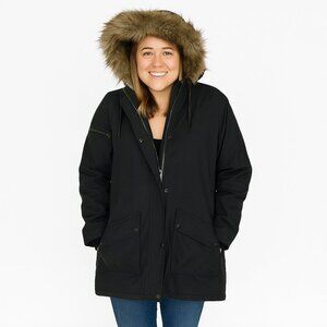 Buffalo David Bitten Jacket Large Grey Faux Fur Asymmetrical Zip Hooded Winter