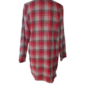 This is a flannel gray, white and red cotton button up. Is a great lumberjack shirt/jacket and can be worn nicely with tights and tall boots.