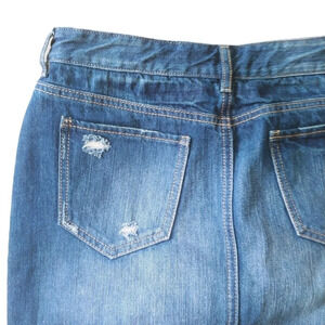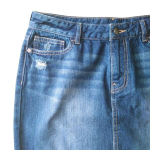 Blue jean denim cotton mid rise skirt with fading and distressing. 100% cotton rigid skirt. No stretch.