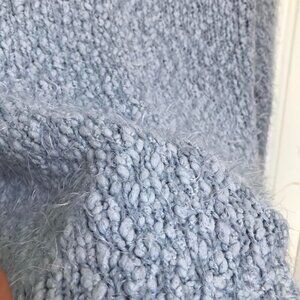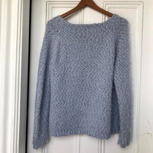The soft blue works perfectly with jeans any day of the week! The scraggily nature of this sweater makes it unusual and incredibly soft!! In great condition comes as a women's size large.
