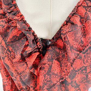 ⋆ A striking red animal snake-print dress with long sleeves, featuring playful tiers of ruffles along the neckline and cascading down the bottom. The flowy, flouncy silhouette adds movement and charm, making this piece both bold and unique.