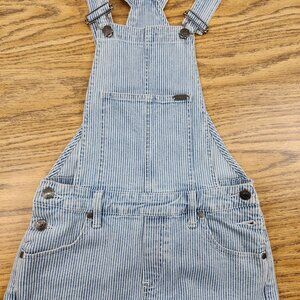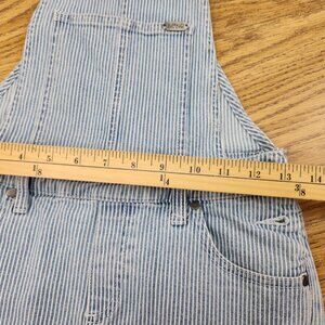 Cute and casual denim shortalls in classic blue-and-white pinstripe. Features adjustable straps, front bib pocket, rolled hems, and functional side/back pockets.