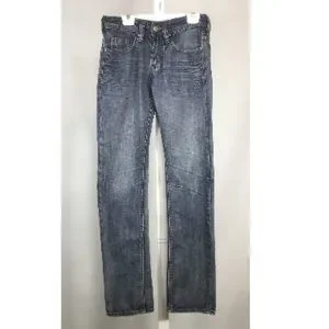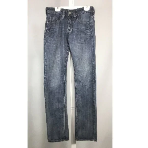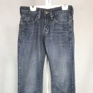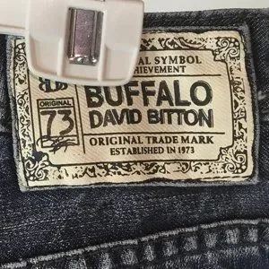 Pre-faded, distressed jeans by David Bitton for Buffalo. Narrow leg style. Not stretchy.