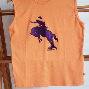 Orange with Purple Sparkle Graphic of Cowboy Riding Bronco Horse. By Buffalo Jeans Co. Size L. 65% Polyester 35% Cotton. Labeled Buffalo David Bitton. Worn Once and washed once.