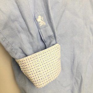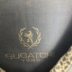 Beautiful Bugatchi Uomo patterned shirt is almost striped with a paisley pattern running through it, please reference photos. Blue with flip cuffs can be worn both formally on as a casual shirt. Please reference photos for condition.