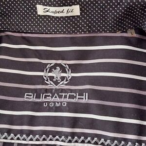 Keywords: Bugatchi, Men's Shirt, Striped Shirt, Size Large, Shaped Fit, 100% Cotton, Black and White Striped, Stylish, Classic, Perfect for Any Occasion
