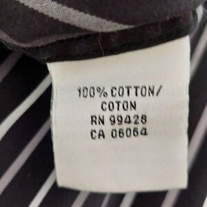 This men's Bugatchi size large shaped fit 100% cotton striped shirt is perfect for any occasion. The shirt is made of a soft, stretchy fabric that will keep you comfortable all day long. The black and white striped pattern is both stylish and classic, and the shaped fit will flatter your body type. This shirt is sure to turn heads wherever you go.