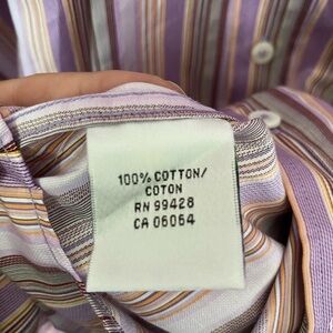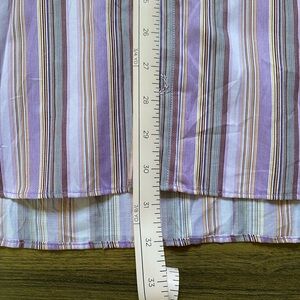 Stylish Bugatchi shirt with vibrant stripes. Lots of pinks and purples. Very eye catching.Would look great to attend a wedding, wear to work or on a date!