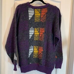 Tricot vintage pour homme de la marque Bugatchi Uomo au motif graphique audacieux, dans des tons de mauve, orange, jaune et gris. Maille texturée et coupe confortable, typique du style artistique des années 80–90. Une pièce forte et originale, de belle qualité.