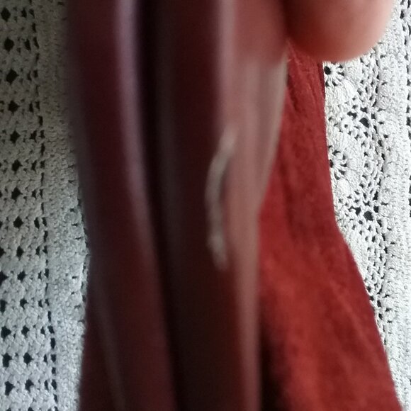 I love this bag! It is vintage Bugatti clutch from the 1980s: burgundy genuine suede leather with metal trimmed closure. The lining is brown satin and is in excellent condition. The bag does not appear to have been used much. The only flaw/wear that I can see are on the top edge corners (photos of those are included above). Those marks are hard to see when the bag is closed. The suede is in great condition. It still has much life left in it!