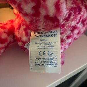 Charming pink patterned bear with heart nose. Soft and huggable. Ideal for kids. Build a Bear.
