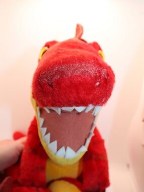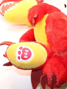 Soft red and yellow dinosaur plush from Build-A-Bear. Bright red fur with yellow accents for playful appeal. Durable stitching and friendly design for everyday cuddles. Makes a cheerful gift for kids who love dinosaurs. Pre-owned.
