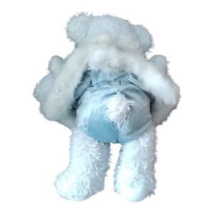 Dressed in a sparkling, blue and silver glitter fur lined top and skirt, this is a vintage Build-A-Bear. It is 16 inches tall, and has unique fur - soft white with spikes of pale blue. His nose and mouth are embroidered in blue. I don't know if the clothes are from the "Frozen" movie era, but they are sweet for winter!