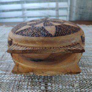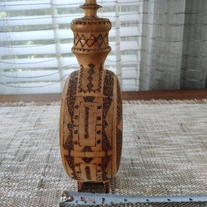 Bulgarian Wooden Bottle Pyrography Flask Wood Burned Graphics VTG Decanter 9.25"