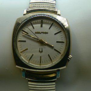 Bulova Accutron Mens Watch, case is in excellent condition with a few small marks (and engraved on case back), crystal is clear with no marks or scratches, band is an era correct replacement with some wear on the plating where the wrist would touch a desk