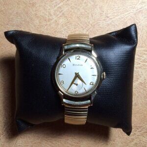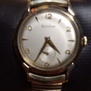 This is a rare and beautiful vintage timepiece by Bulova, 10k gold filled, with small seconds dial. It is the real deal, with a classic timeless design. It's in good condition with minor blemishes or scratches and natural patina, given its age. The watch is in good working condition. (Please see photos for more details.). I do not offer any guarantees for the waterproof capabilities or accuracy of this watch given its age, and suggest it not be used in showers, baths, swimming or related activities. Suffice it to say this Bulova watch has been reliable and worked well for the years I have owned it.