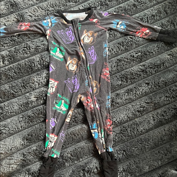 Cozy black one-piece pajama with colorful Transformers-inspired mask prints. Soft, breathable fabric for comfortable all-night wear. Easy front zipper for quick changes and secure fit. Fun green, blue, purple and red accents kids will love.