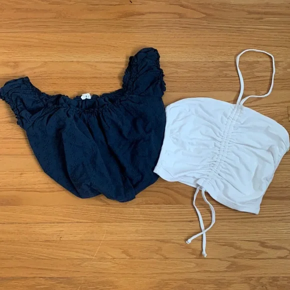 Bundle of 2 Tops White Halter Top Front Ruching (adjustable) New With Tag Cotton Blend XS Navy Eyelet Top Can be worn off the shoulder 100% Cotton XS